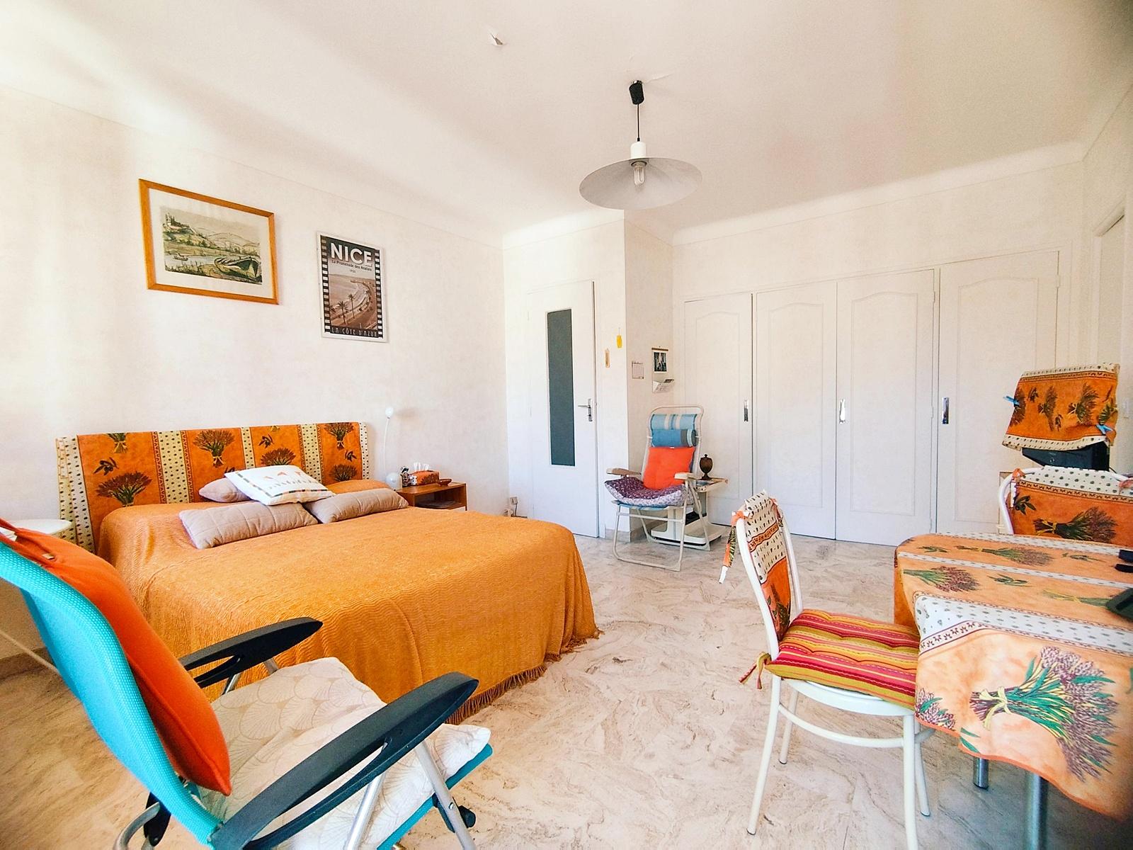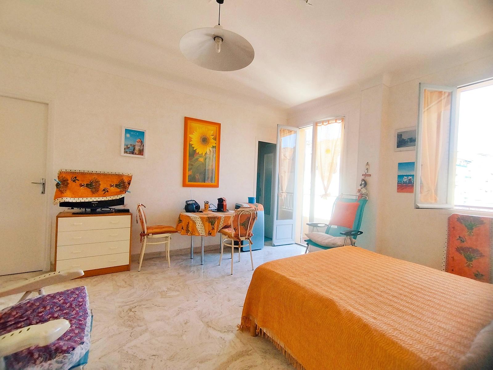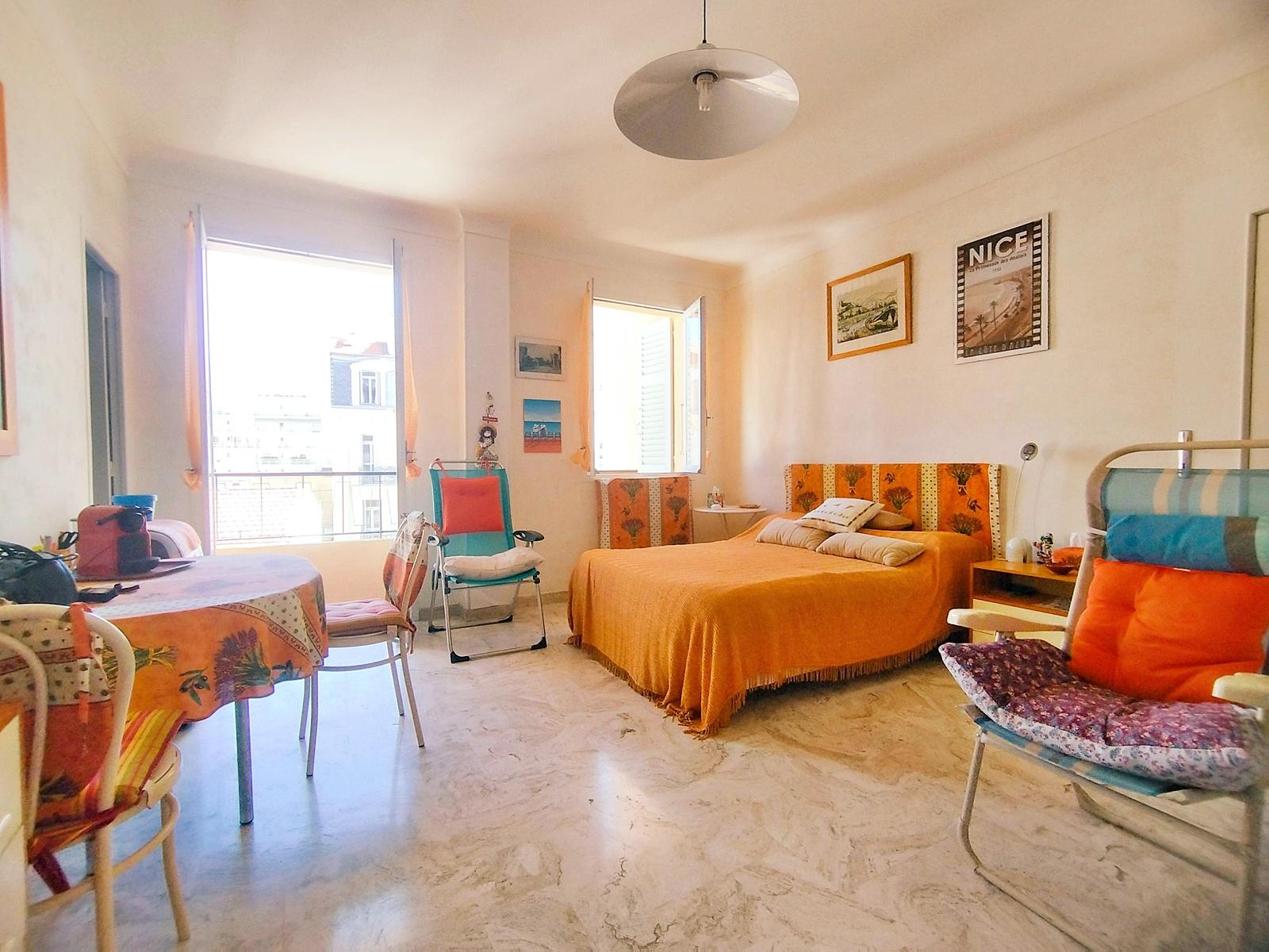 Spacieux F1 situé au 4ème étage d'un immeuble de standing avec ascenseur. Si l'intérieur sera à moderniser, l'appartement offre des arguments certains - Très au calme sur cour avec vue dégagée - Belle luminosité grâce à son exposition tournée vers le sud - coin cuisine séparé - 4 rangements dans la pièce principale. Un emplacement rêvé pour un pied à terre en plein centre de Nice, avec accès à pied aux plages, restaurants, tram.