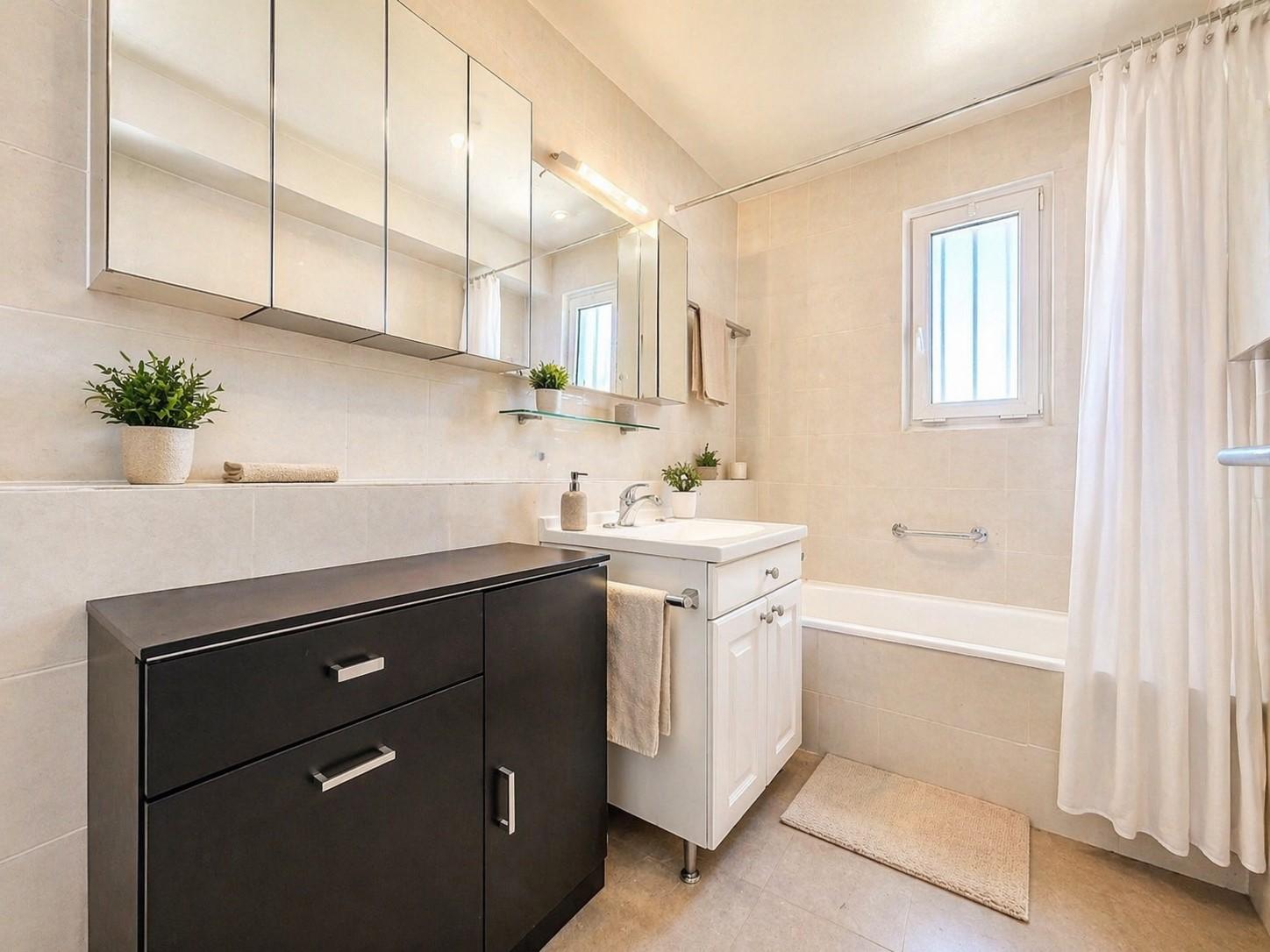 Climatisation réversible dans le séjour, salle de bains avec fenêtre, cuisine avec balcon.