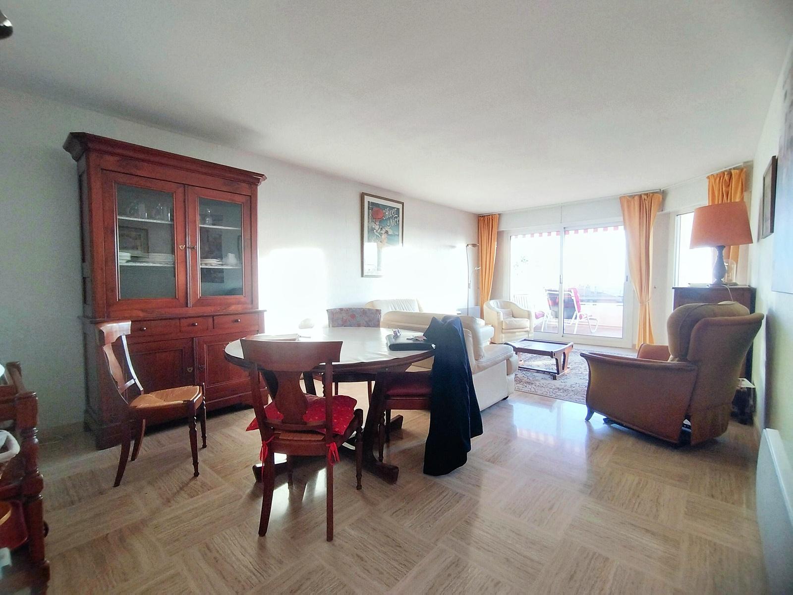 . Belle distribution pour cet appartement avec notamment un séjour de 28m² et cuisine aménagée de 9m², les 2 pièces donnant accès à une belle terrasse tournée vers la Mer et le Cap d'Antibes. Sur l'arrière de l'appartement, le coin nuit climatisé, bien séparé de la partie jour avec un vestibule qui dessert 2 belles chambres de 11,5m² avec penderie pour chacune. Salle d'eau avec WC et un second WC indépendant.